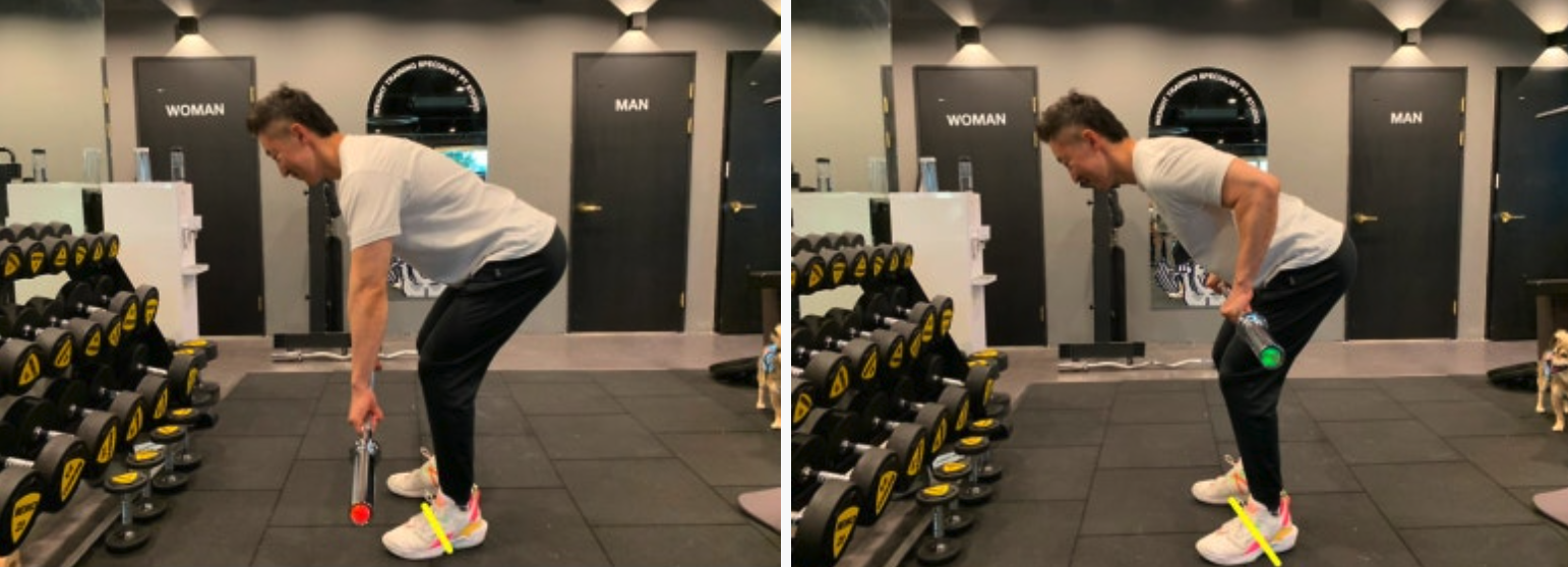 허리를 중립 상태로 유지한 채 고관절을 접으면서 상체를 앞으로 기울입니다.