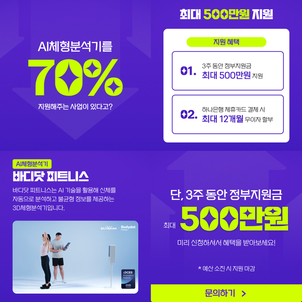 런칭 이후 세계 최대 IT·가전 박람회인 CES 2025에서 체형분석기 최초 혁신상까지 수상하고 스포애니, 에이블짐, 어반필드와 같은 대형 프랜차이즈에서도 빠르게 도입 중인 바디닷 피트니스를 지금 정부 지원 사업을 통해 5월 말까지 최대 500만 원을 지원받아 구매하실 수 있는 기회가 있어 소개드립니다.