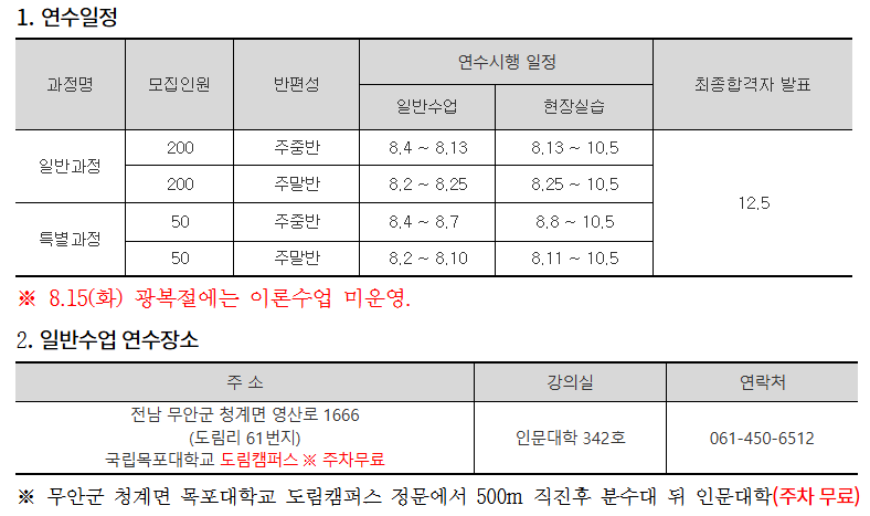 ㅇ 연수생의 편의를 위해 별도의 비용 지불 후 목포대학교 기숙사 이용가능