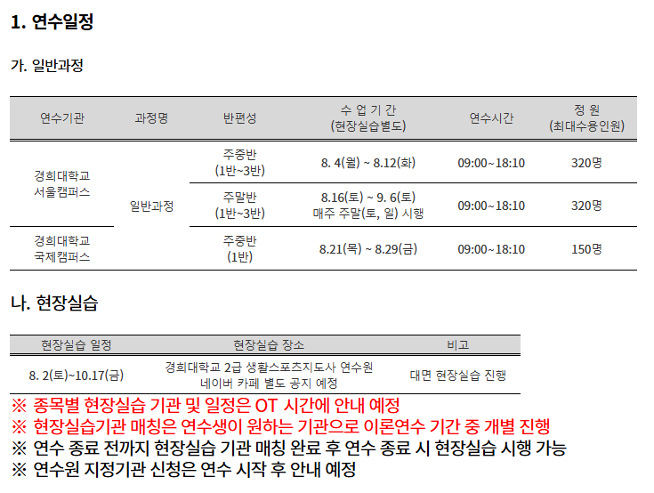 ㅇ 연수 및 현장실습 공지사항은 경희대학교 2급 생활스포츠지도사 연수원 네이버 카페에 공지 확인 바랍니다. https://cafe.naver.com/khuinsports