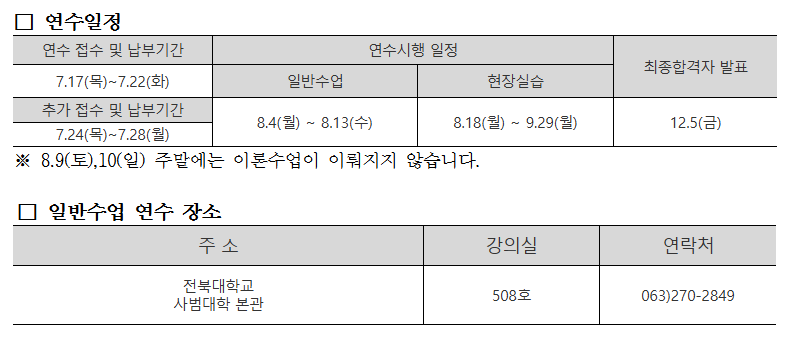 ※ 추후 안내사항은 전북대학교 생활스포츠지도사 연수원 홈페이지(sports.jbnu.ac.kr) 공지사항을 통해 확인해주시기 바랍니다.