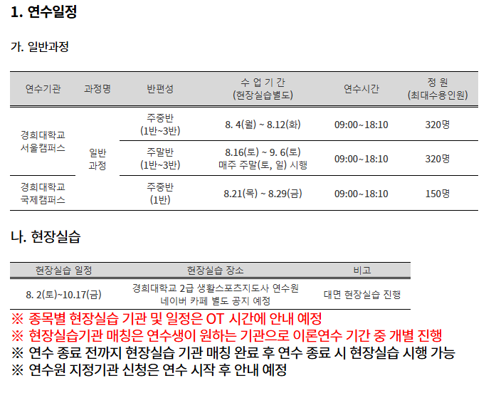 ㅇ 연수 및 현장실습 공지사항은 경희대학교 2급 생활스포츠지도사 연수원 네이버 카페에 공지 확인 바랍니다. https://cafe.naver.com/khuinsports